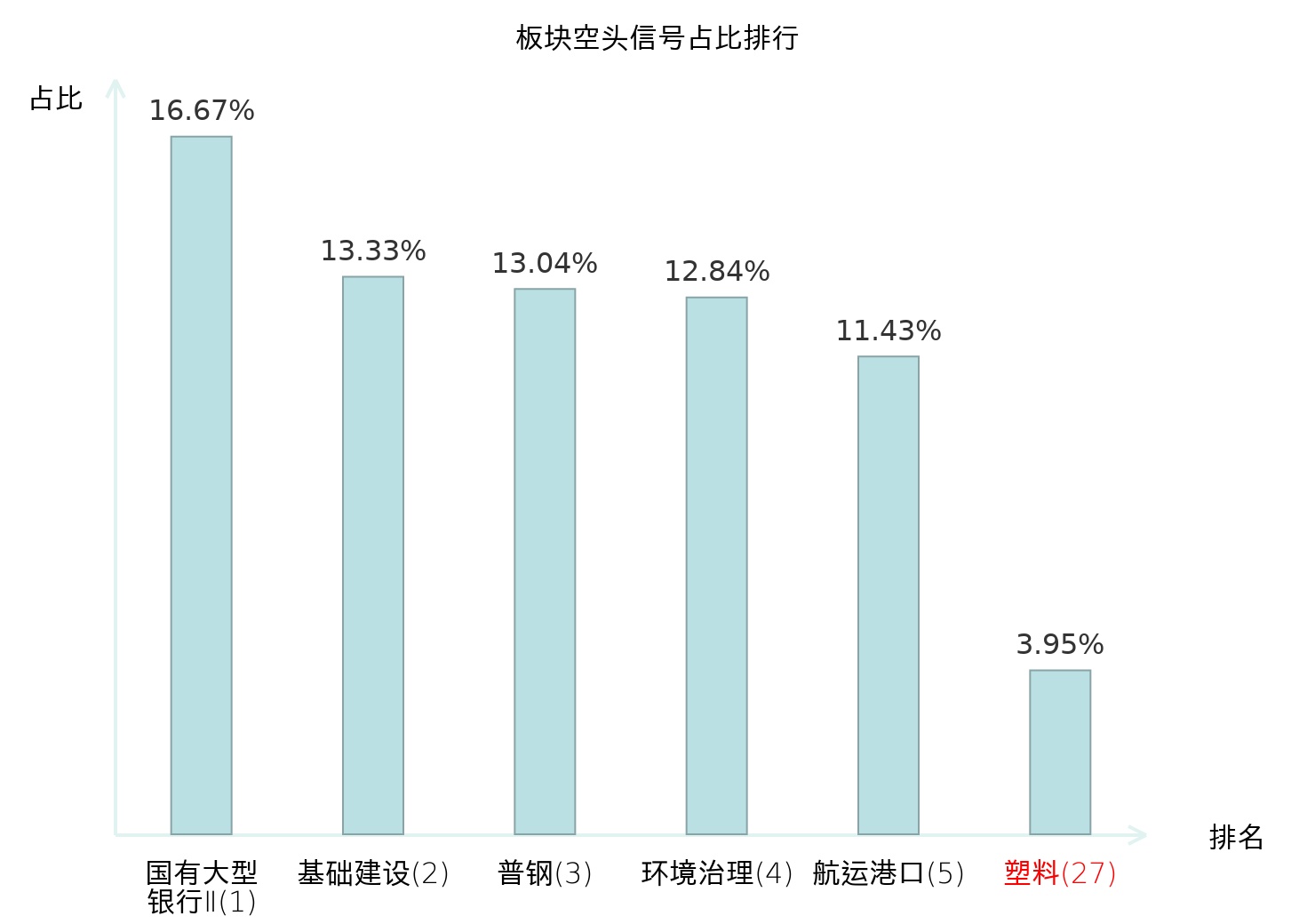全市场所有行业板块中主力空头信号占比排名中,国有大型银行Ⅱ板块位居第一。环境治理板块名次提升最快,较昨日上升123位。
