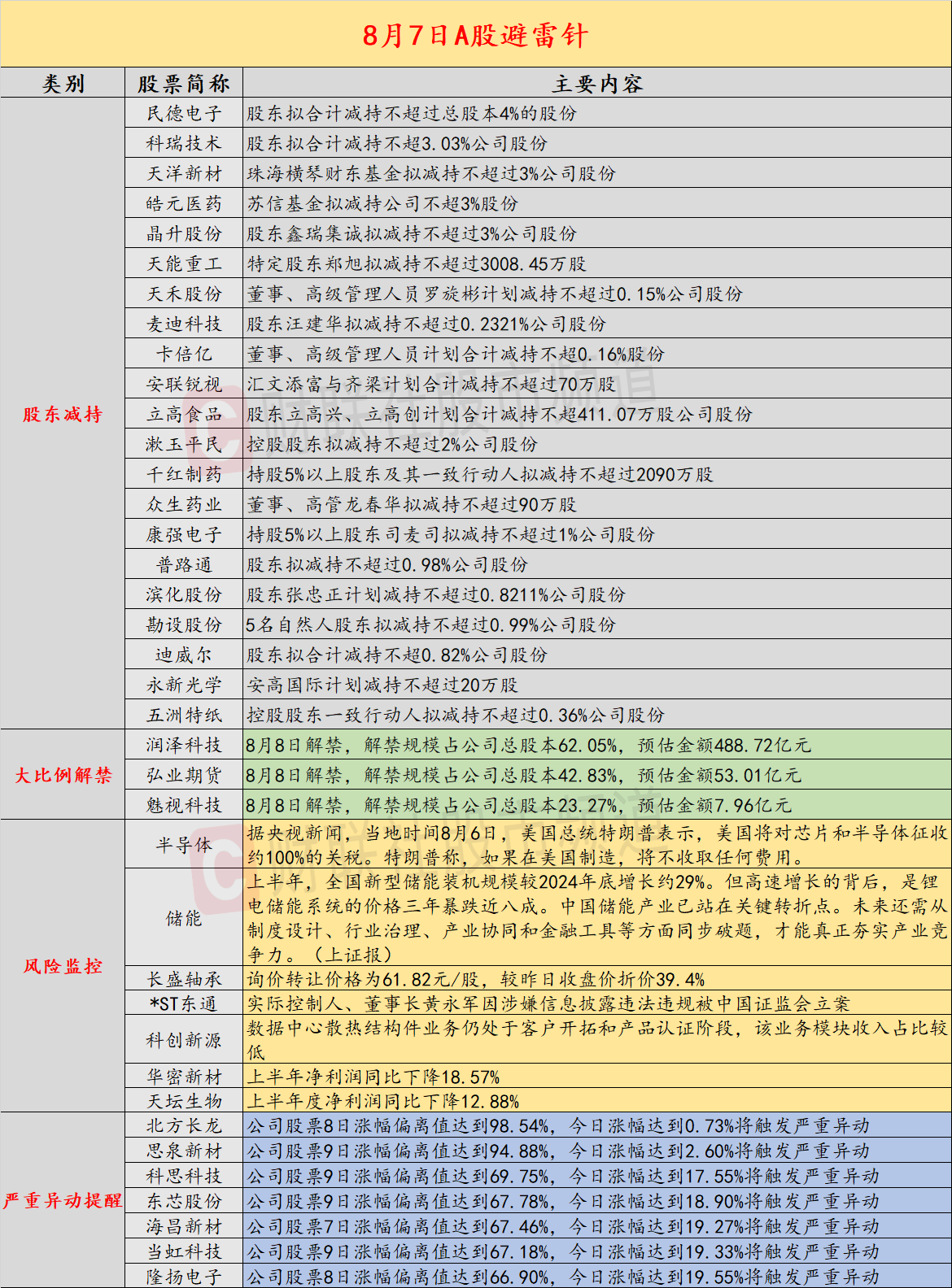 导读:财联社8月7日投资避雷针,近日,A股及海外市场潜在风险事件如下。国内经济信息方面包括:1)锂电储能系统价格三年暴跌近八成;2)Q3服务器DDR4成交显著降温,制程切换致DDR5内存价格持续上扬;公司方面重点关注包括:1)长盛轴承询价转让价格为61.82元/股,较昨日收盘价折价39.4%;2)*ST东通实际控制人、董事长黄永军因涉嫌信息披露违法违规被中国证监会立案;海外市场重点关注包括:1)特朗普称美将对芯片和半导体征收约100%的关税;2)智利铜矿事故造成生产中断,将对铜供应造成冲击。