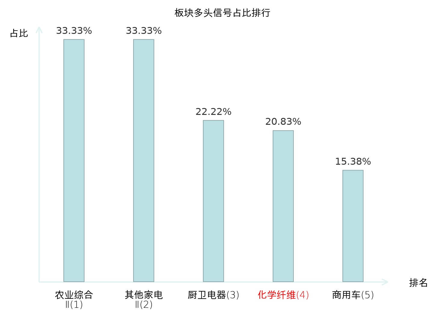 全市场所有行业板块中主力多头信号占比排名中,农业综合Ⅱ板块位居第一。其他家电Ⅱ板块名次提升最快,较昨日上升128位。