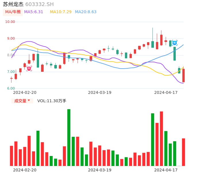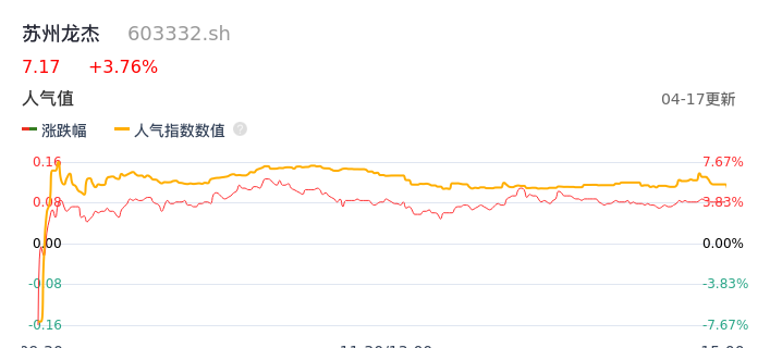 04月17日,苏州龙杰收报7.17,股价涨幅3.76%,成交金额8026.83万元,换手率5.22%。