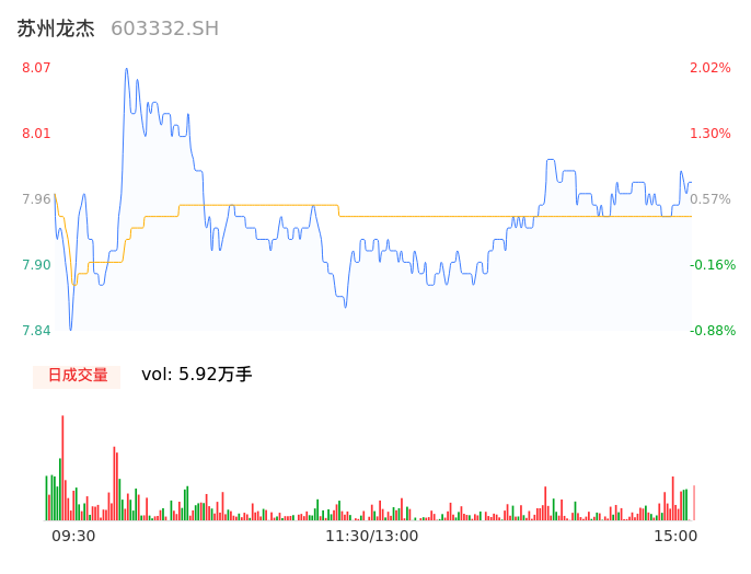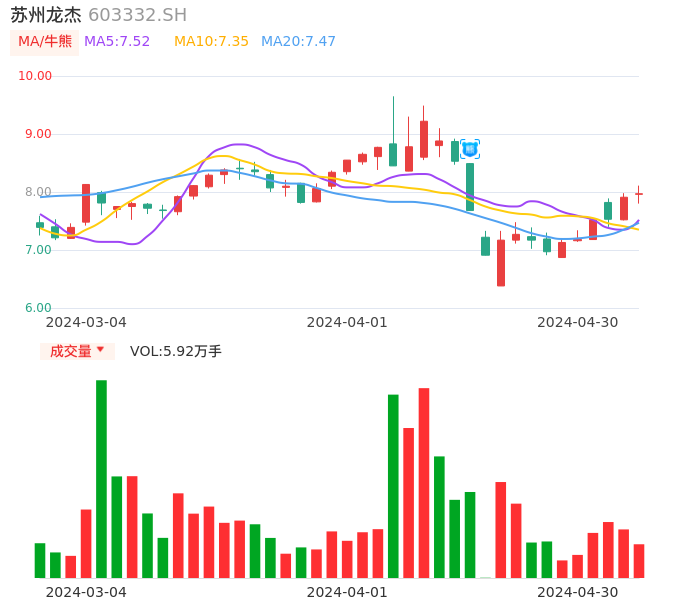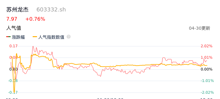 04月30日,苏州龙杰收报7.97,股价涨幅0.76%,成交金额4699.84万元,换手率2.74%。