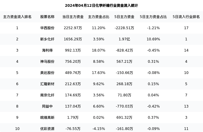 从主力资金流向来看,化学纤维行业今日主力资金流入5.84亿元,在所有申万二级行业中排名:119/131。