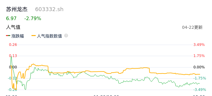 04月22日,苏州龙杰收报6.97,股价涨幅-2.79%,成交金额4335.83万元,换手率2.85%。