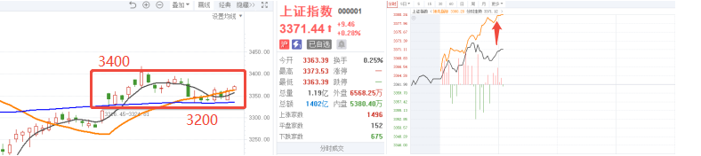 上证指数,在60日均线处得到强支撑,重回20日均线上方。市场整体状态稳定,延续区间震荡的格局。上方3400左右是重要的压力位,作为重要观察点。下方3200点区间下沿太过遥远,以60日均线为重要观察。