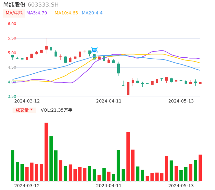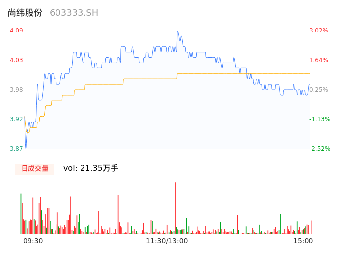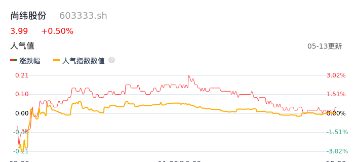 05月13日,尚纬股份收报3.99,股价涨幅0.50%,成交金额8552.54万元,换手率3.43%。
