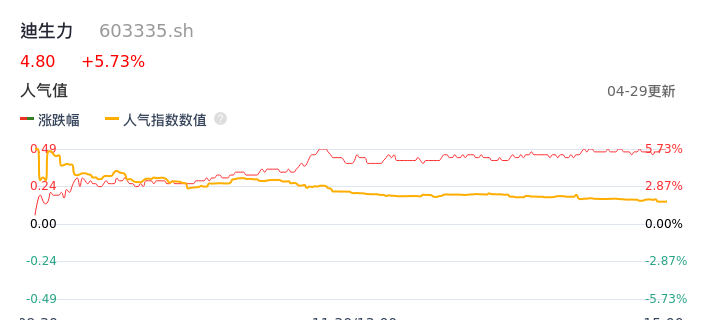 04月29日,迪生力收报4.80,股价涨幅5.73%,成交金额4440.10万元,换手率2.20%。