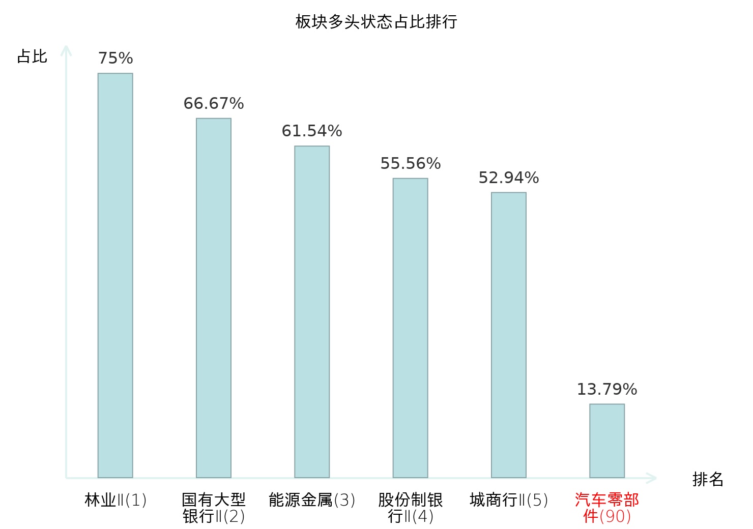 全市场所有行业板块中主力多头状态占比排名中,林业Ⅱ板块位居第一。动物保健Ⅱ板块名次提升最快,较昨日上升82位。