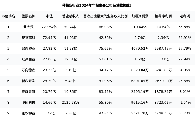 宏辉果蔬最新报告期数据为年报,下表汇总了种植业行业内市值靠前的公司年报主要经营数据
