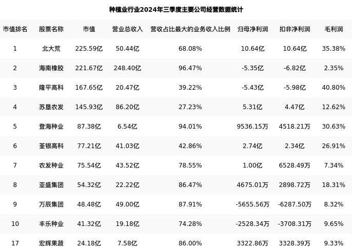 宏辉果蔬最新报告期数据为三季度,下表汇总了种植业行业内市值靠前的公司三季度主要经营数据