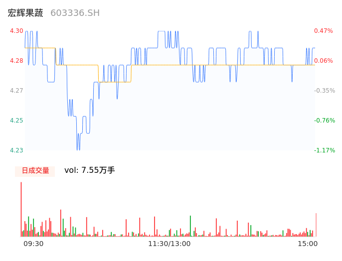 04月02日,宏辉果蔬收报4.30,股价涨幅0.47%,成交金额3233.44万元,换手率1.32%。