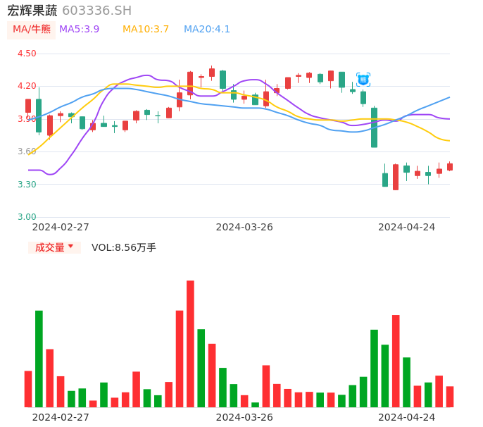 04月24日,宏辉果蔬收报3.49,股价涨幅1.45%,成交金额2975.56万元,换手率1.50%。