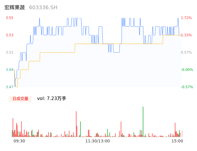 04月25日,宏辉果蔬收报3.54,股价涨幅1.43%,成交金额2548.54万元,换手率1.27%。