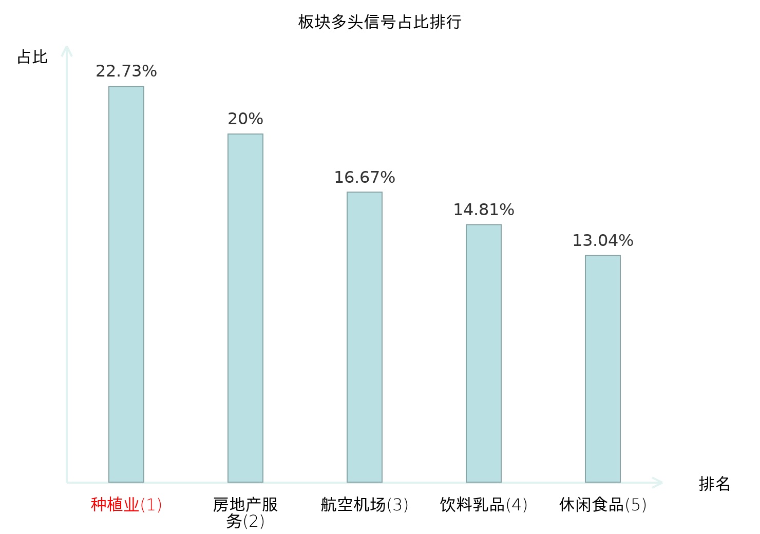 全市场所有行业板块中主力多头信号占比排名中,种植业板块位居第一。厨卫电器板块名次提升最快,较昨日上升109位。