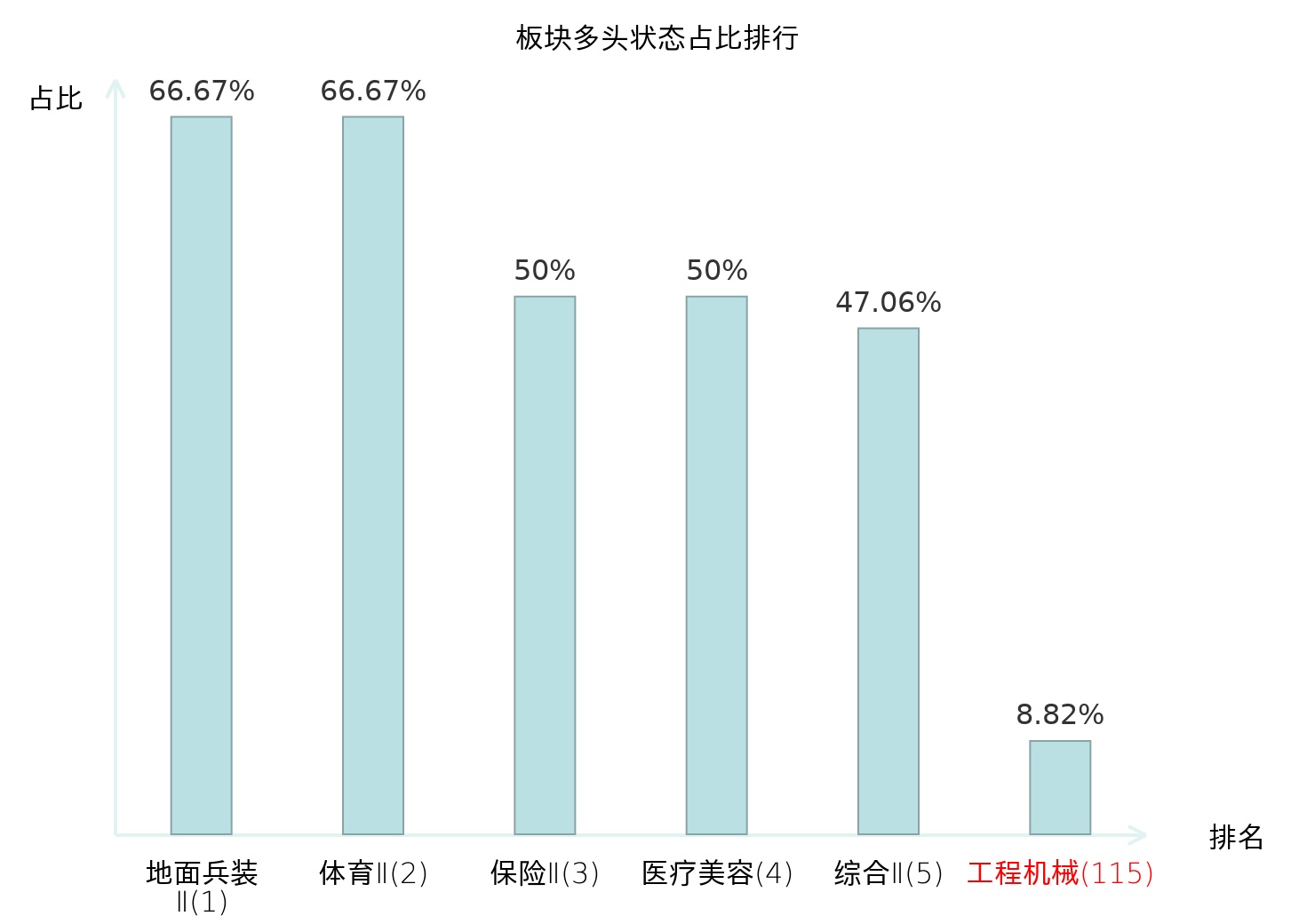 全市场所有行业板块中主力多头状态占比排名中,地面兵装Ⅱ板块位居第一。保险Ⅱ板块名次提升最快,较昨日上升82位。