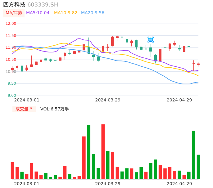 04月29日,四方科技收报10.33,股价涨幅-0.10%,成交金额6784.75万元,换手率2.12%。