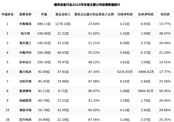 四方科技最新报告期数据为年报,下表汇总了通用设备行业内市值靠前的公司年报主要经营数据