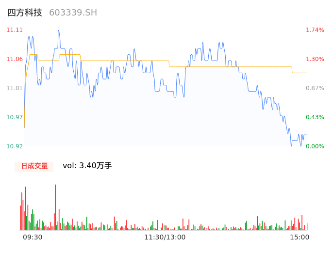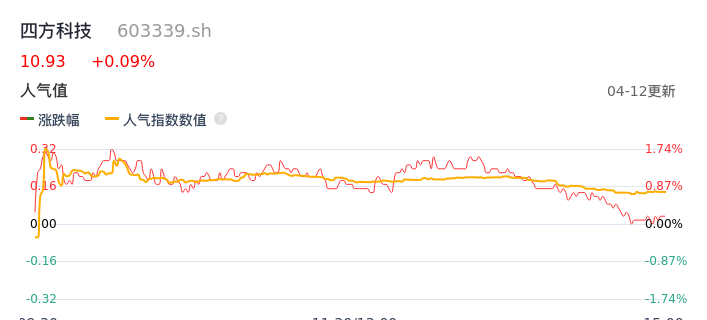 04月12日,四方科技收报10.93,股价涨幅0.09%,成交金额3755.98万元,换手率1.10%。