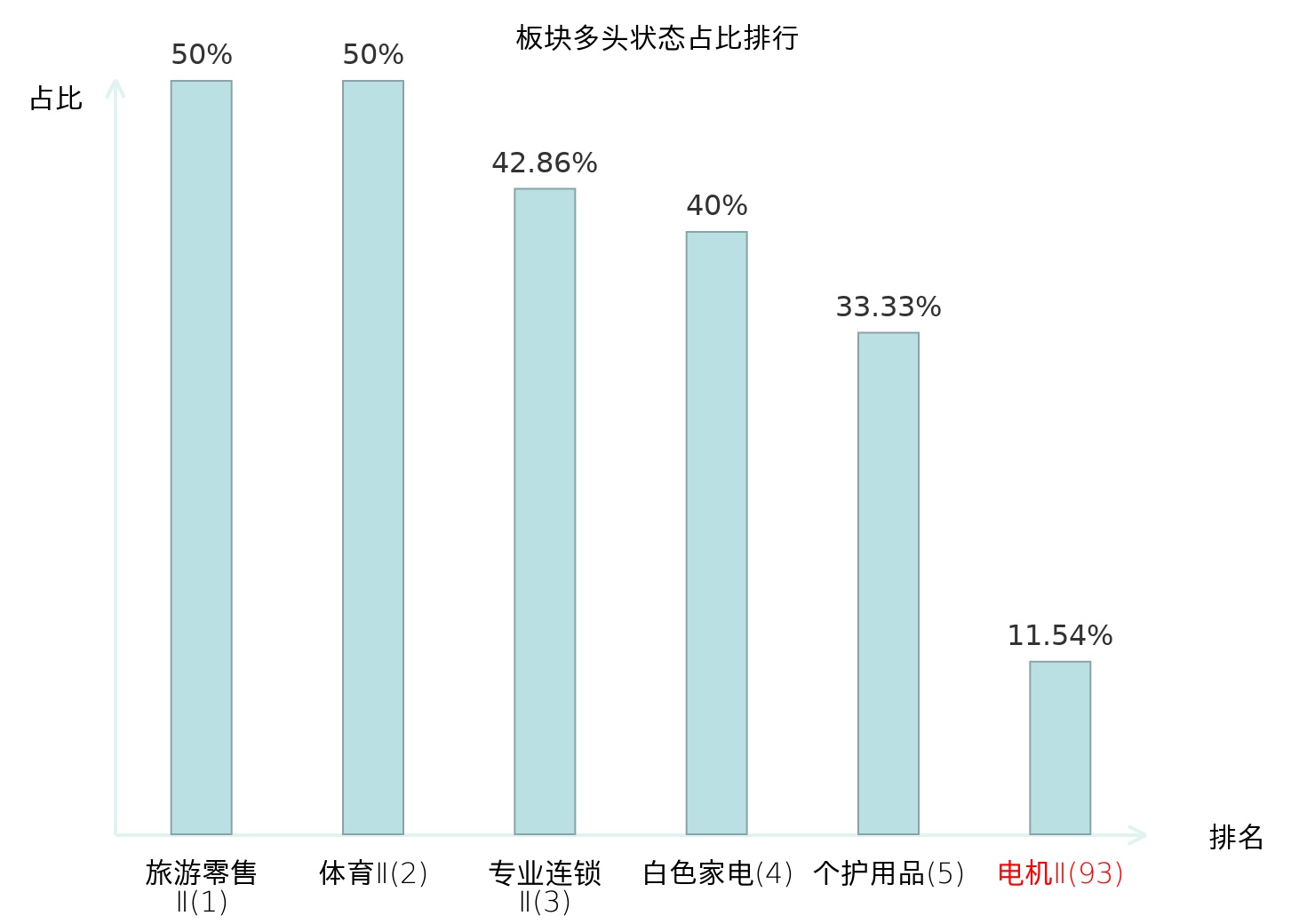 全市场所有行业板块中主力多头状态占比排名中,旅游零售Ⅱ板块位居第一。化学原料板块名次提升最快,较昨日上升35位。