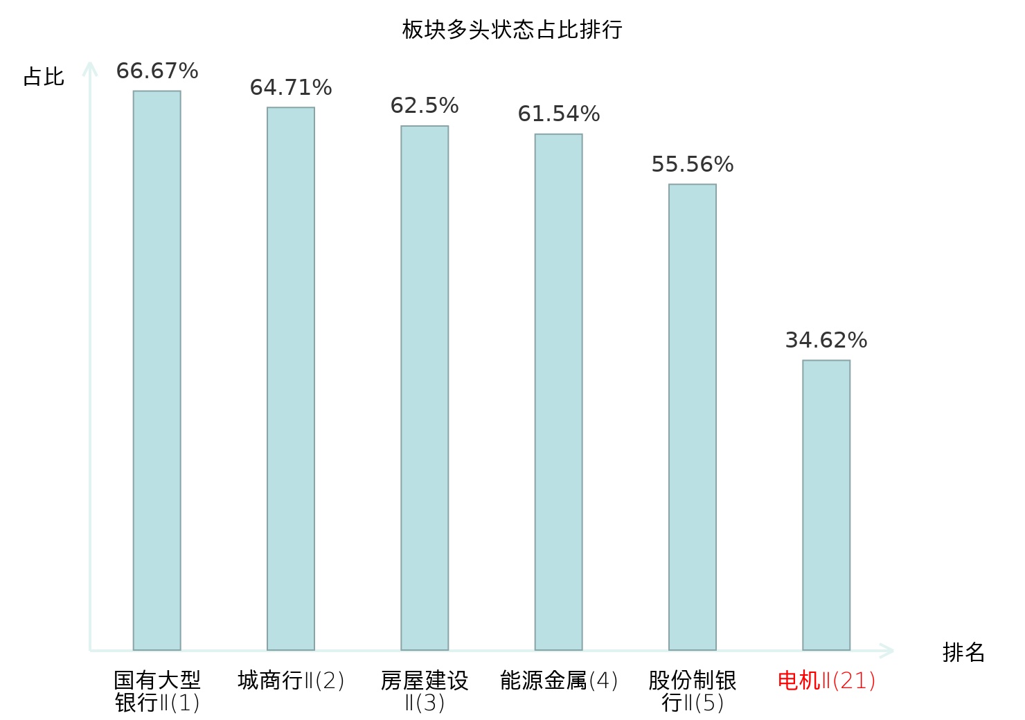 全市场所有行业板块中主力多头状态占比排名中,国有大型银行Ⅱ板块位居第一。普钢板块名次提升最快,较昨日上升65位。