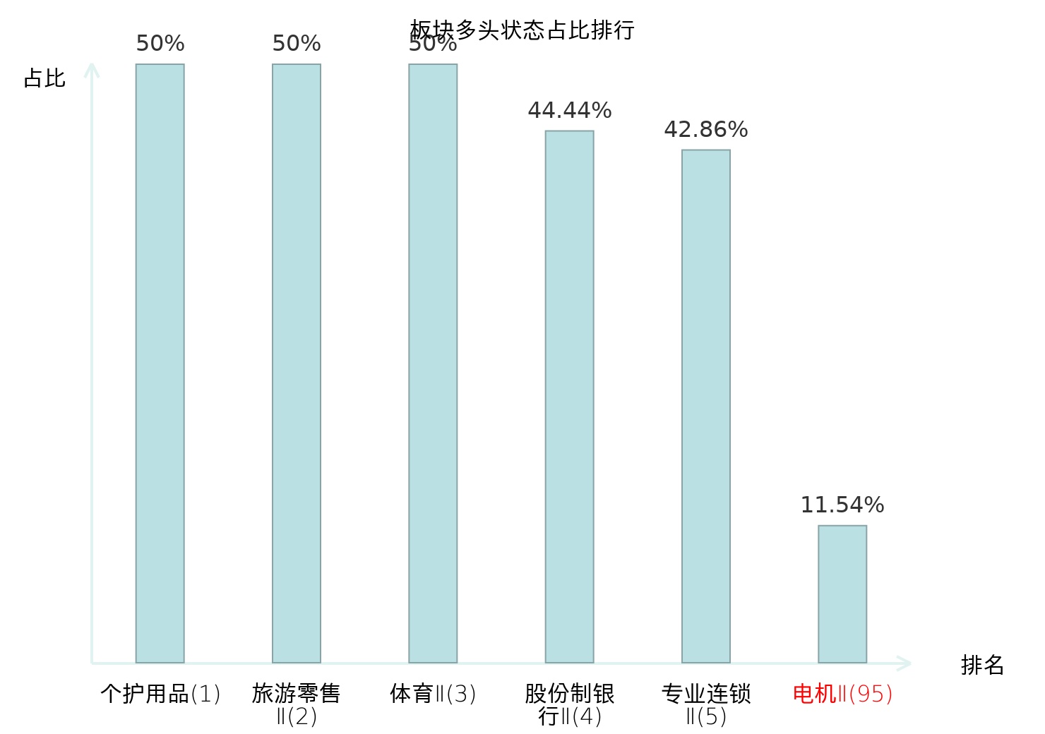 全市场所有行业板块中主力多头状态占比排名中,个护用品板块位居第一。非金属材料Ⅱ板块名次提升最快,较昨日上升37位。