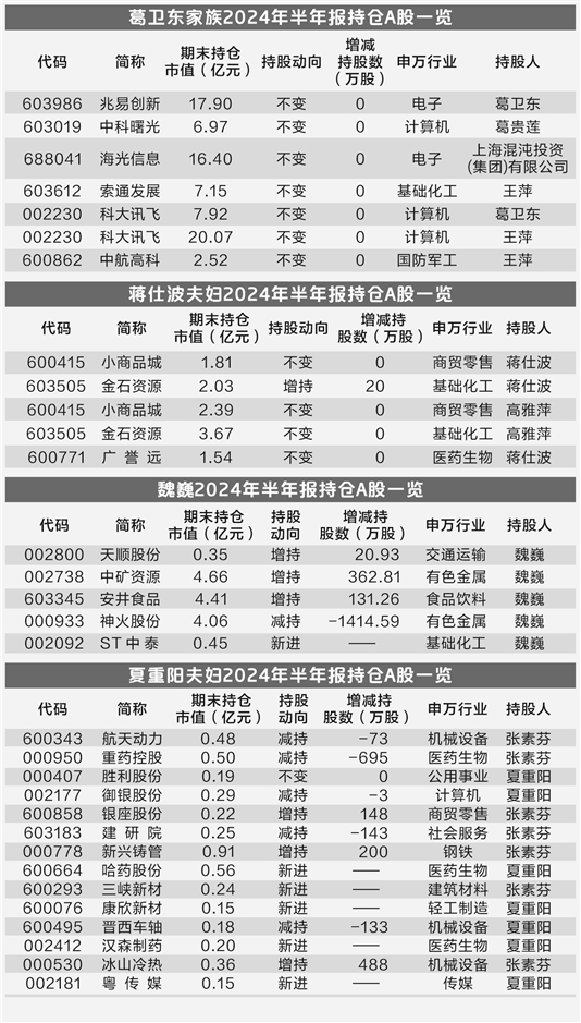 赵建平、赵吉父女持仓7月以来平均跌幅最大,超过18%,重仓的臻镭科技7月以来跌近21%,帝奥微跌超19%,美埃科技跌近19%。葛卫东家族持仓跌幅也普遍较大,7月以来平均跌幅接近12%,兆易创新、科大讯飞两只个股均跌超20%。