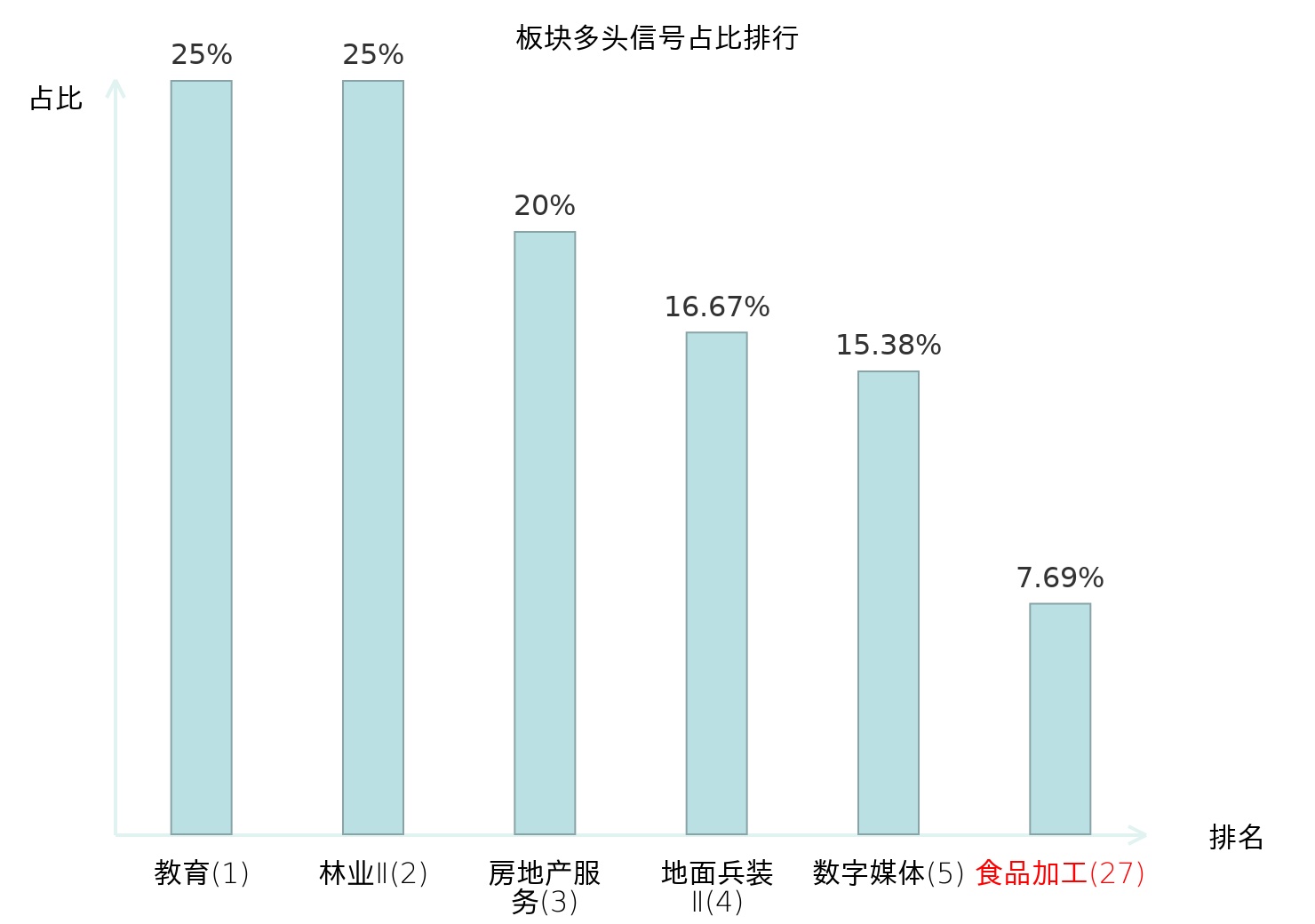 全市场所有行业板块中主力多头信号占比排名中,教育板块位居第一。林业Ⅱ板块名次提升最快,较昨日上升125位。