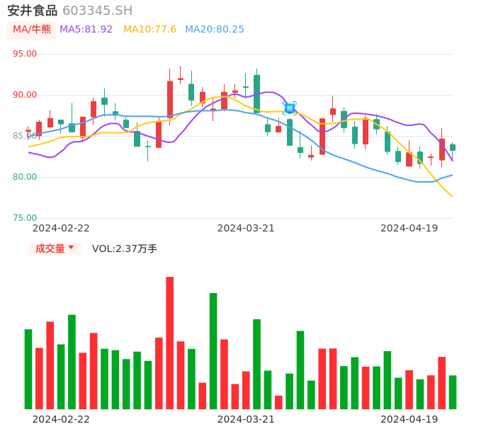 04月19日,安井食品收报83.23,股价涨幅-1.67%,成交金额1.96亿元,换手率0.81%。