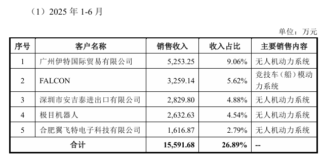 2025年1-6月,该公司前五大客户分别为广州伊特国际贸易有限公司、FALCON、深圳市安吉泰进出口有限公司、极目机器人、合肥翼飞特电子科技有限公司。