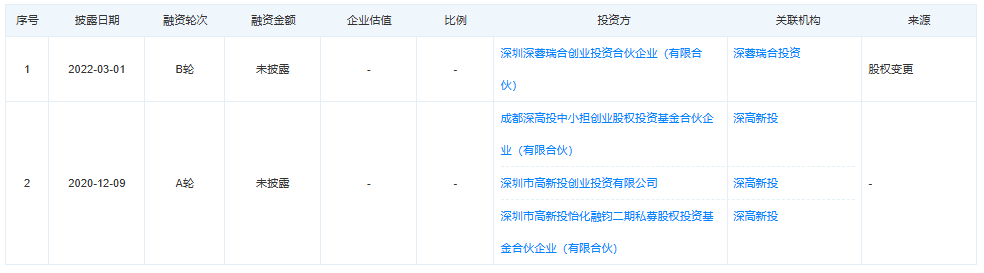 成立至今,好盈科技共经历2轮融资。其A轮融资发生在2020年12月,投资方为成都深高投中小担创业股权投资基金合伙企业(有限合伙)、深圳市高新投创业投资有限公司、深圳市高新投怡化融钧二期私募股权投资基金合伙企业(有限合伙)。该公司后于2022年3月的B轮中,引入投资方深圳深蓉瑞合创业投资合伙企业(有限合伙)。