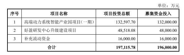 此前,好盈科技于2024年12月启动IPO辅导。本次IPO,该公司拟募集资金19.60亿元,投向“高端动力系统智能产业园项目(一期)”、“好盈研发中心升级建设项目”及“补充流动资金”三个项目。
