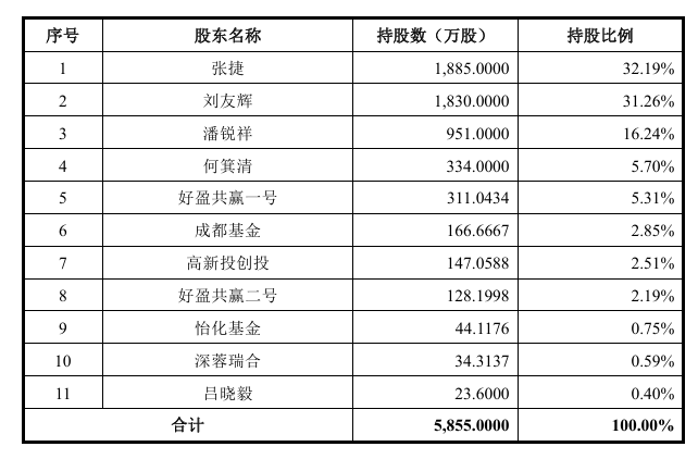 此外,该公司前10大股东还包括成都深高投中小担创业股权投资基金合伙企业(有限合伙)、深圳市高新投创业投资有限公司、深圳市高新投怡化融钧二期私募股权投资基金合伙企业(有限合伙)、深圳深蓉瑞合创业投资合伙企业(有限合伙),持股比例分别为2.85%、2.51%、0.75%、0.59%。