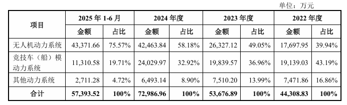 拆分业务来看,上述报告期,好盈科技来自无人机动力系统的收入分别约1.77亿元、2.63亿元、4.25亿元、4.34亿元,分别占比为39.94%、49.05%、58.18%、75.57%,占比逐年升高;来自竞技车(船)模动力系统的收入分别约1.91亿元、1.98亿元、2.40亿元、1.13亿元,增速较为稳健。