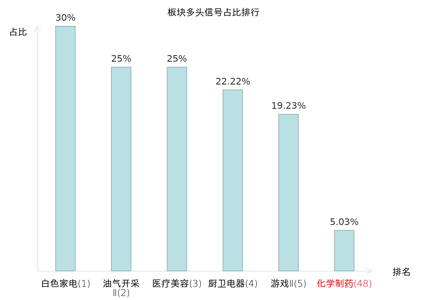 全市场所有行业板块中主力多头信号占比排名中,白色家电板块位居第一。油气开采Ⅱ板块名次提升最快,较昨日上升125位。