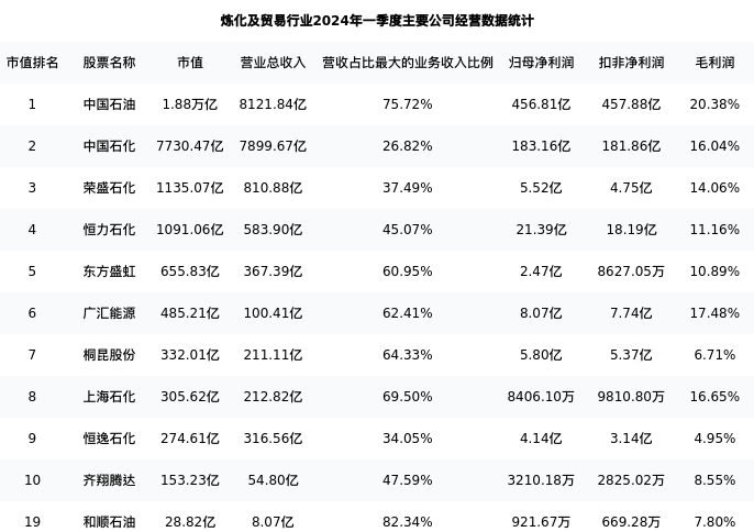 和顺石油最新报告期数据为一季度,下表汇总了炼化及贸易行业内市值靠前的公司一季度主要经营数据