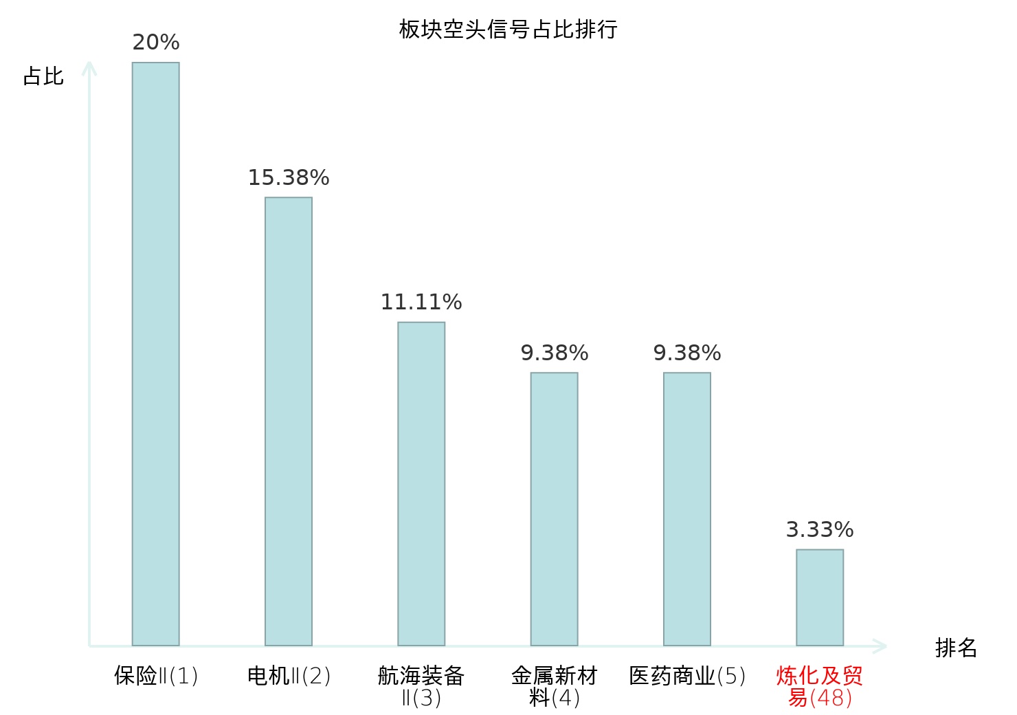 全市场所有行业板块中主力空头信号占比排名中,保险Ⅱ板块位居第一。塑料板块名次提升最快,较昨日上升111位。