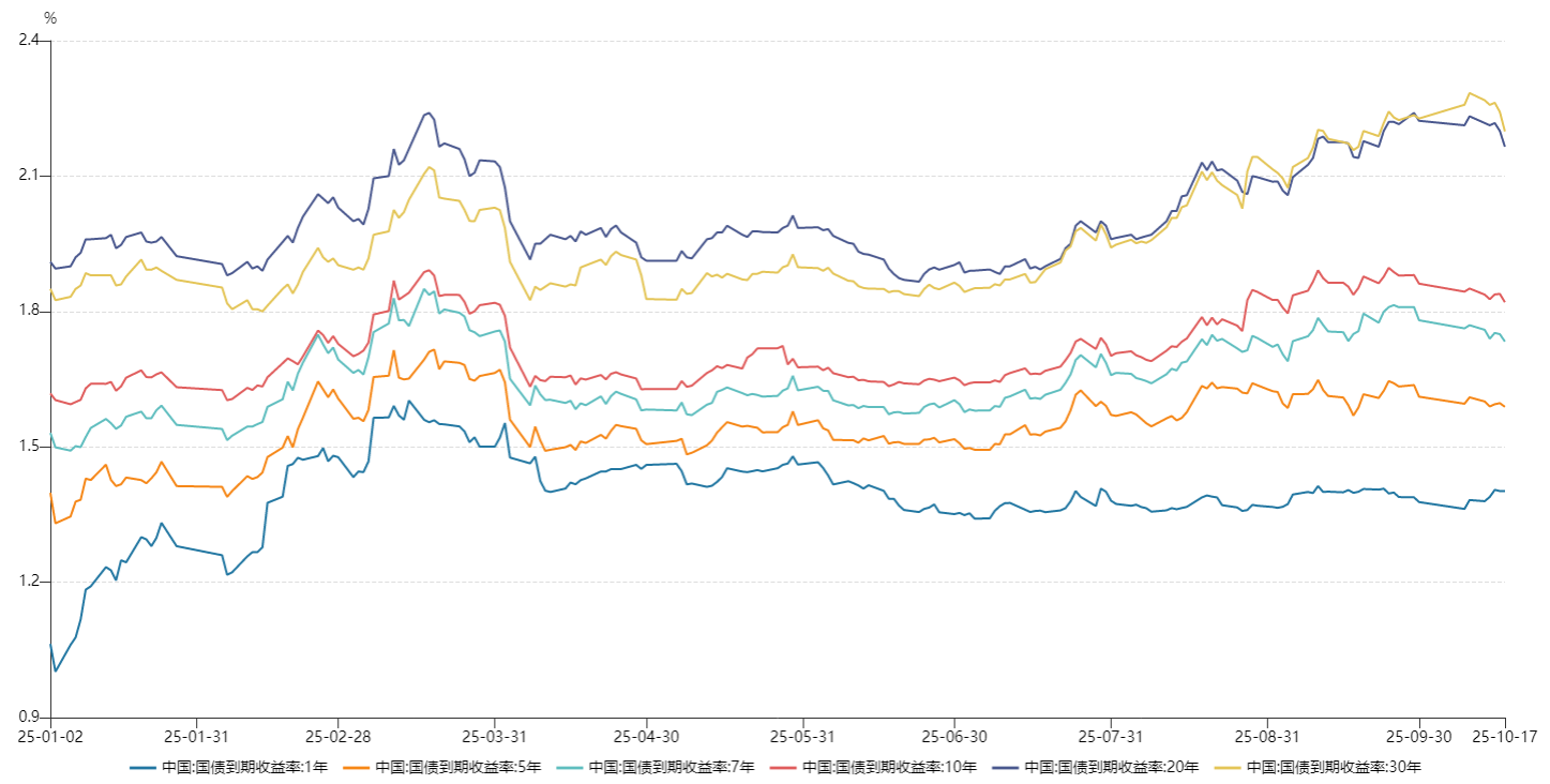 上周,主要利率债收益率震荡下行。截至10月17日收盘,1Y、5Y、7Y国债分别报收1.40%、1.59%、1.73%,分别较前一周收盘变动2BP、-2BP、-4BP;10Y、20Y、30Y国债分别报收1.82%、2.17%、2.2%,分别均较前一周收盘变动-3BP、-7BP、-9BP。