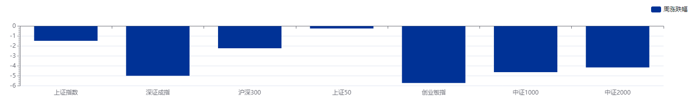 上周,部分权益指数实现不同程度的下跌。其中,上证指数下跌1.47%,深证成指下跌5%,沪深300下跌2.22%,上证50下跌0.24%,创业板指下跌5.71%。而中证1000、2000分别下跌4.62%、4.15%。