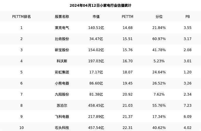 从估值角度看:莱克电气最新市盈率PETTM为14.68,在行业内排名1/20,处于21.84分位。