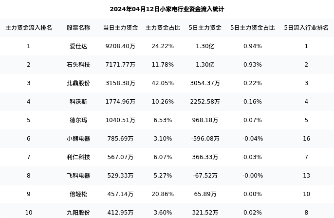 从主力资金流向来看,小家电行业今日主力资金流入8.57亿元,在所有申万二级行业中排名:54/131。