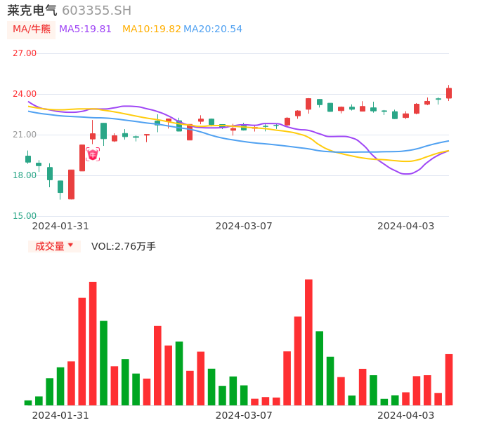 04月03日,莱克电气收报24.42,股价涨幅3.47%,成交金额6659.78万元,换手率0.48%。