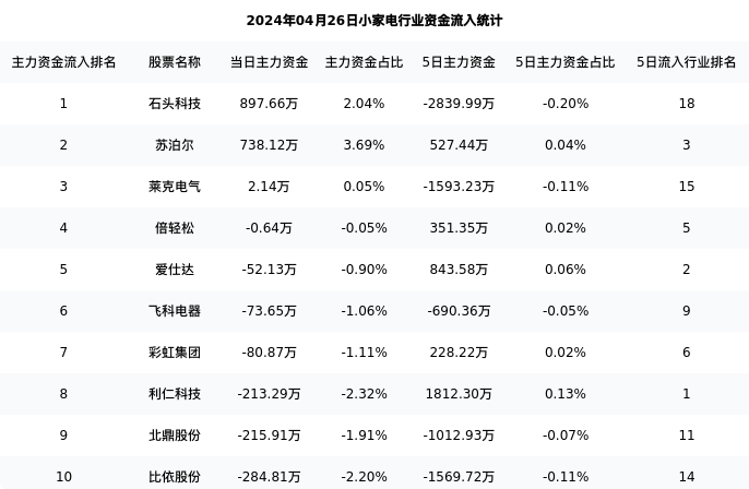 从主力资金流向来看,小家电行业今日主力资金流入5.59亿元,在所有申万二级行业中排名:30/131。
