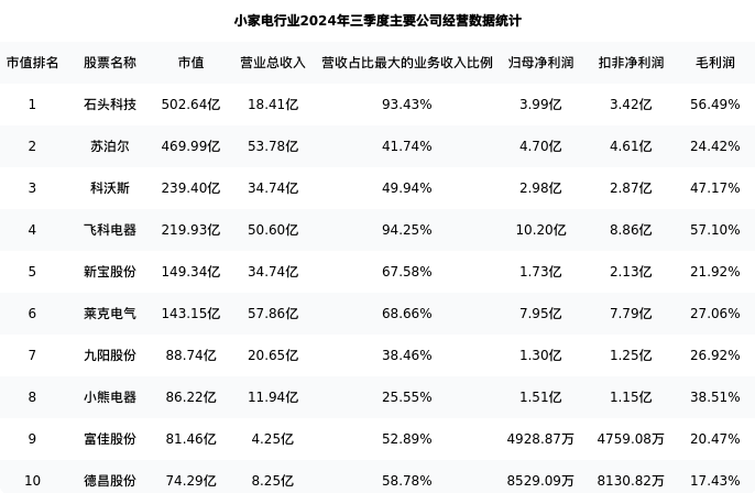 莱克电气最新报告期数据为三季度,下表汇总了小家电行业内市值靠前的公司三季度主要经营数据