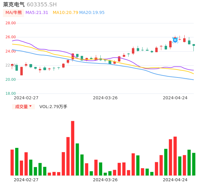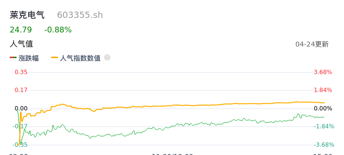04月24日,莱克电气收报24.79,股价涨幅-0.88%,成交金额6827.76万元,换手率0.49%。