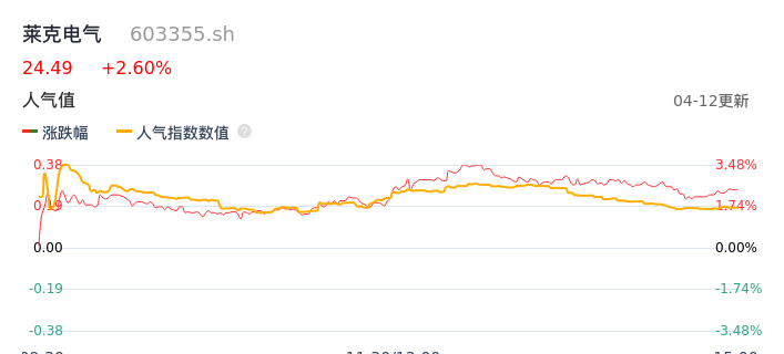 04月12日,莱克电气收报24.49,股价涨幅2.60%,成交金额5040.77万元,换手率0.36%。