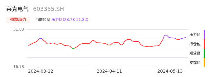 我们来看一下该股的九方特色指标强弱趋势的情况:莱克电气近日从持仓区进入压力区。股价出现一波快速拉升行情,目前上升动能较为充足可继续持股。注意今日上方压力位:31.83元是否能有效突破。