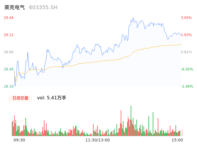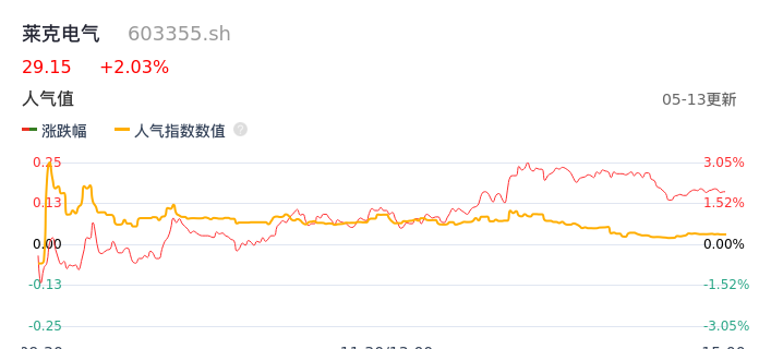 05月13日,莱克电气收报29.15,股价涨幅2.03%,成交金额1.57亿元,换手率0.95%。