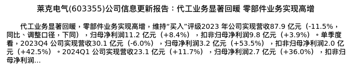 值得注意的是:2024年05月开源证券的吕明/周嘉乐分析师,首次发布关于莱克电气的研究报告,标题为:莱克电气(603355)公司信息更新报告:代工业务显著回暖 零部件业务实现高增。