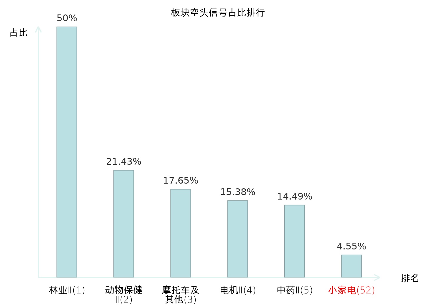 全市场所有行业板块中主力空头信号占比排名中,林业Ⅱ板块位居第一。动物保健Ⅱ板块名次提升最快,较昨日上升109位。