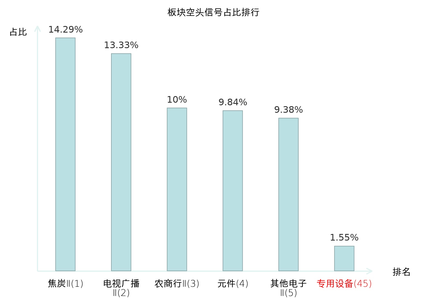 全市场所有行业板块中主力空头信号占比排名中,焦炭Ⅱ板块位居第一。农化制品板块名次提升最快,较昨日上升123位。