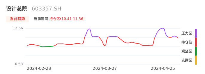 我们来看一下该股的九方特色指标强弱趋势的情况:设计总院近日从压力区回到持仓区。股价快速拉升后出现持续调整。后续主要关注下方支撑位:10.41元是否能启稳回升。